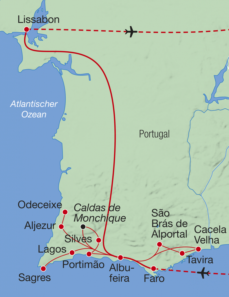 1. Tag, Schweiz - Faro - Albufeira: Individuelle Anreise zum Flughafen Zürich oder Fahrt vom Einsteigeort zum Flughafen Zürich (gegen Zuschlag). In Begleitung Ihrer Reiseleitung fliegen Sie nach Faro. Am Flughafen erwartet Sie der lokale Car, der Sie zu Ihrem Hotel in Albufeira bringt.