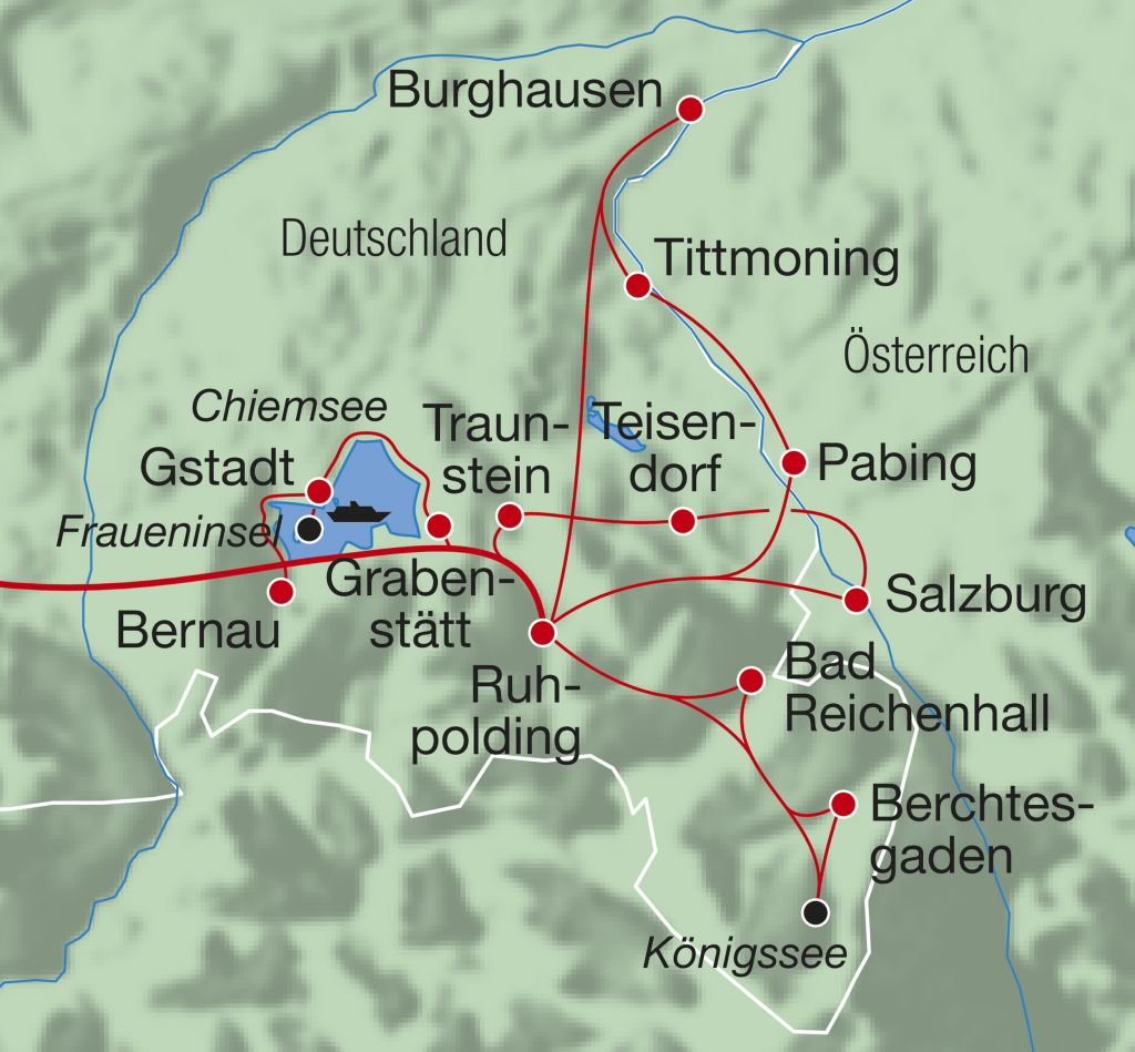 2. Tag, Ausflug Chiemsee-Rundfahrt: Nach dem Frühstück bringt Sie der Marti-Car nach Grabenstätt, dem Startpunkt der heutigen Etappe. Nur wenige Kilometer später erreichen Sie Chieming am wunderschönen Chiemsee, der auch als «Bayerisches Meer» bekannt ist. Von nun an folgen Sie dem Chiemsee-Radweg, einem der schönsten Radwege Bayerns. Vorbei an traumhaften Aussichten auf die Chiemsee-Inseln und das Alpenpanorama fahren Sie nach Gstadt, wo Sie die Velos parken. Eine kurze Schifffahrt später erreichen Sie für den Mittagshalt die malerische Fraueninsel. Die Insel ist bekannt für das Benediktinerinnenkloster Frauenwörth sowie für traditionelle Töpfereien und Fischereibetriebe. Frisch gestärkt geht die Tour am Nachmittag ab Gstadt weiter, erneut entlang des Chiemseeufers, vorbei an idyllischen Badebuchten und Fischerhütten. Dabei begleitet Sie stets der fantastische Panoramablick auf die Chiemgauer Alpen. Rückfahrt mit dem Marti-Car ab Bernau. (Tagesroute: ca. 43 km; 160 hm auf und ab)