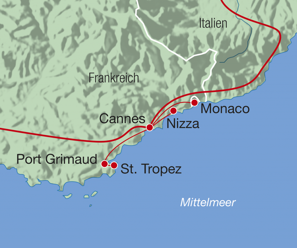 Reisen Sie an die französische Riviera und entdecken Sie die glanzvolle Welt der Seebäder Cannes und Nizza sowie das elegante Fürstentum Monaco. Auch die landschaftliche Schönheit der rund 240 km langen Küste mit der berühmten Corniche d’Or wird Sie verzaubern.