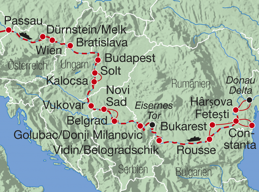 Eine Reise auf der Donau durch Zeit und Vielfalt: Von kaiserlicher Eleganz über wilde Natur bis hin zu lebendiger Geschichte. Sie durchqueren acht Länder, erleben kontrastreiche Landschaften, entdecken pulsierende Städte und gleiten ins geheimnisvolle Donaudelta.