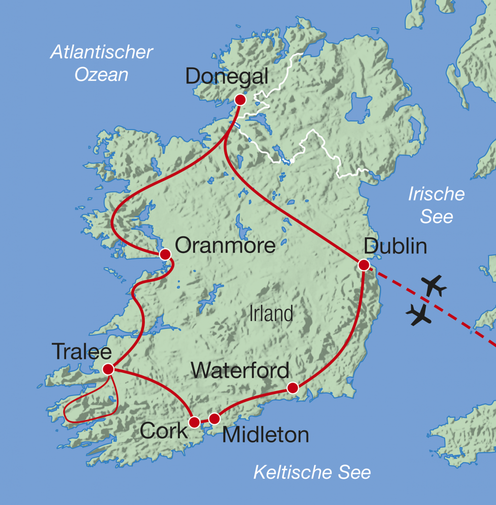 1. Tag, Schweiz - Dublin - Waterford: Individuelle Anreise zum Flughafen Zürich oder Fahrt vom Einsteigeort zum Flughafen Zürich (gegen Zuschlag). In Begleitung Ihrer Reiseleitung fliegen Sie nach Dublin, der Hauptstadt Irlands. Weiterfahrt im lokalen Car nach Waterford. Halbpension.