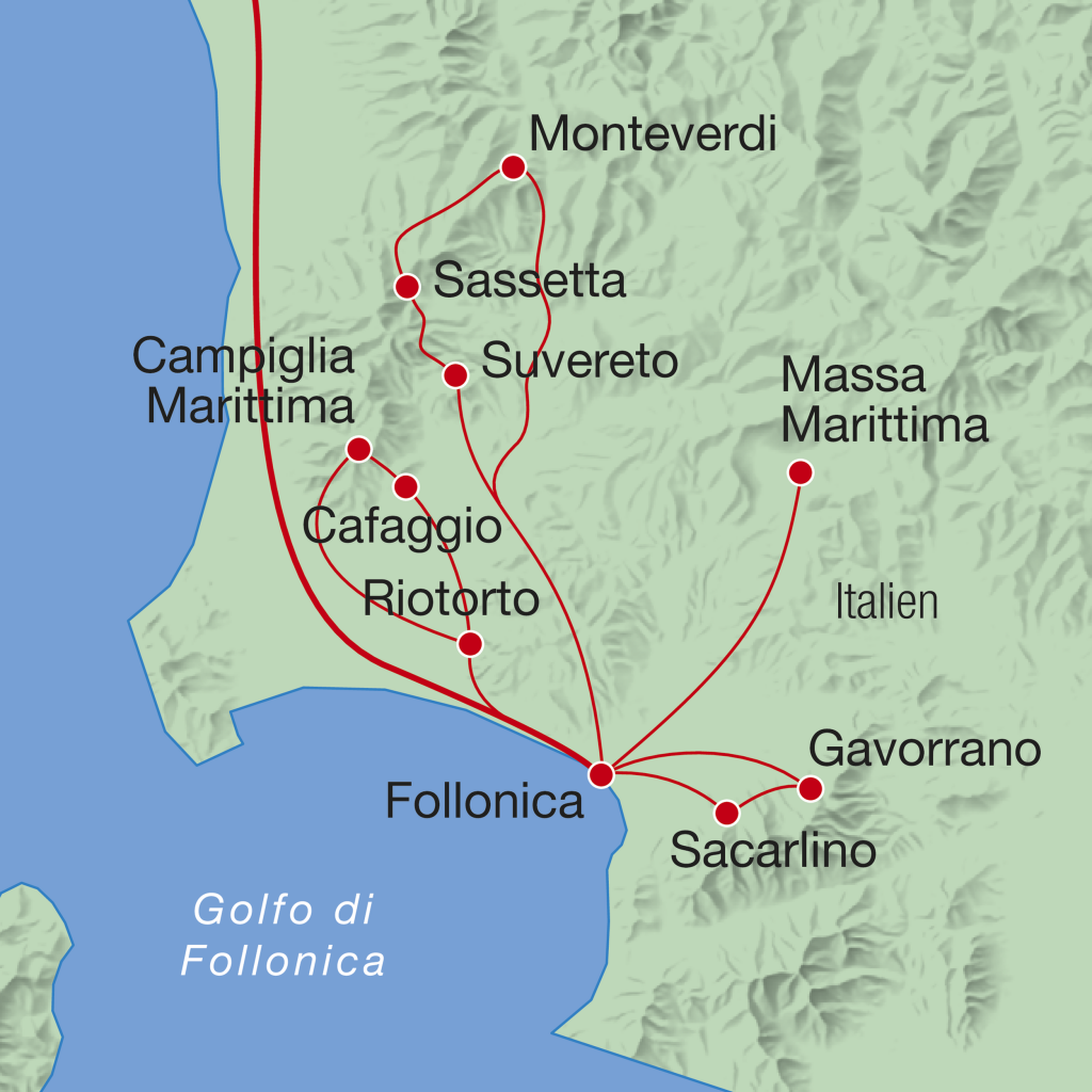 Starten Sie aktiv in den Frühling und entdecken Sie die Vielfalt der Toskana. Glasklare Buchten, sanfte Hügel und charmante Dörfer erwarten Sie rund um Follonica und die milden Temperaturen und blühenden Landschaften machen den Frühling zur idealen Reisezeit. Ob beim Weingenuss im idyllischen Rebberg, auf gemütlichen Halbtagestouren oder längeren Tagesrouten - diese Reise bietet die perfekte Kombination aus Aktivität und Genuss. Lassen Sie sich von der Toskana verzaubern und erleben Sie die Schönheit der Region auf zwei Rädern.