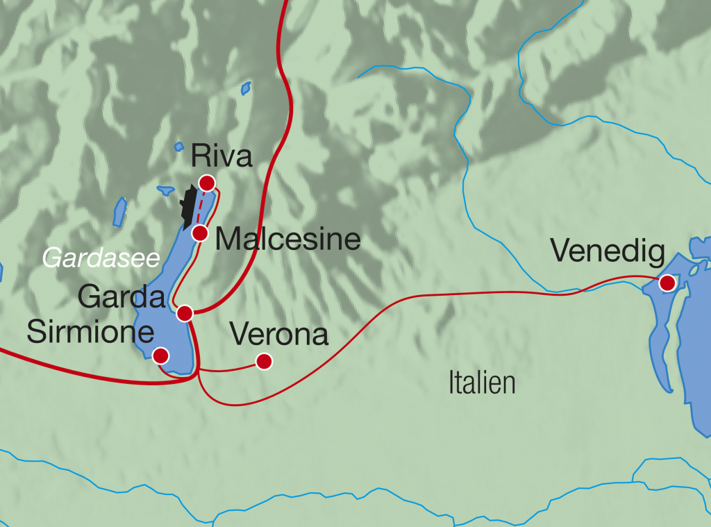 Reisen Sie mit uns zum grössten See Italiens, dem Gardasee. Durch das milde Klima gedeiht hier eine üppige, mediterrane Vegetation. Lassen Sie sich von der wunderbaren, farbenprächtigen Naturlandschaft und den Gegensätzen von hohen Bergen, klarem Wasser und pittoresken Dörfern verzaubern. Sie besuchen einzigartige Städte wie Verona, Sirmione und Venedig und haben überall Zeit, um durch die romantischen Gassen zu bummeln.