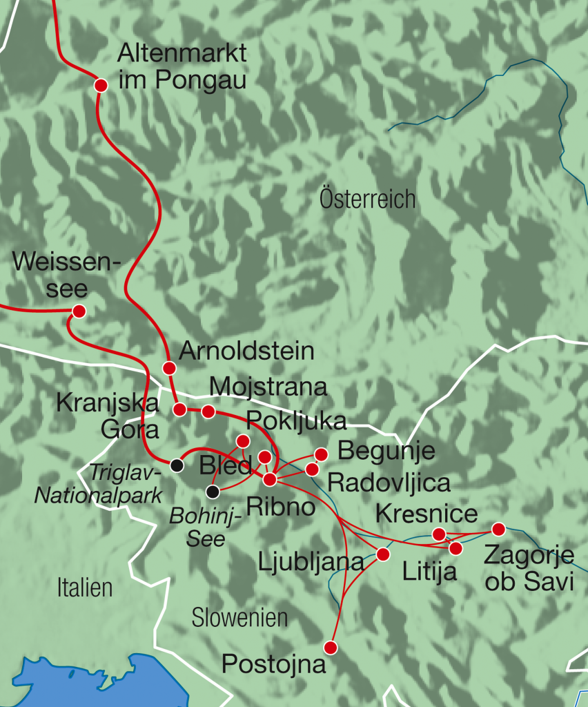 Malerische Flüsse, glasklare Seen und die eindrucksvolle Kulisse der Julischen Alpen prägen diese abwechslungsreiche E-Bike-Reise. Sie erkunden die schönsten Regionen Sloweniens: vom Triglav-Nationalpark über die Karsthöhlen von Postojna bis zur charmanten Hauptstadt Ljubljana. Dazwischen laden Orte wie Bled, Bohinj oder Radovljica zum Verweilen ein. Eine Reise voller landschaftlicher Höhepunkte und kultureller Entdeckungen.