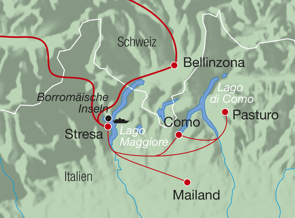 Majestätisch und südländisch zugleich präsentiert sich der Lago Maggiore – eine Landschaft voller Kontraste und Eleganz. Dank des milden Klimas gedeihen hier Kamelien, Palmen und Zypressen, während im Hintergrund die Gipfel der Alpen leuchten. Die Atmosphäre ist von Leichtigkeit und italienischem Lebensgefühl geprägt. Sie entdecken bei einer Schifffahrt die Borromäischen Inseln, die mit prachtvollen Palästen, blühenden Gärten und charmanten Fischerdörfern verzaubern. Ebenso eindrucksvoll ist ein Abstecher an den Comer See. Natürlich darf der Besuch Mailands, der pulsierenden Metropole der Mode, Kultur und Geschichte, nicht fehlen.