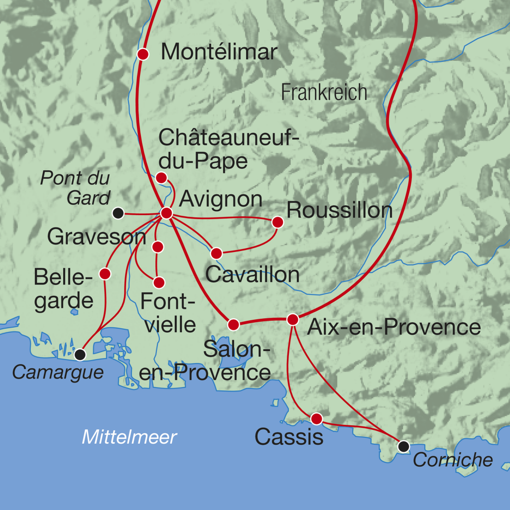 Südfrankreich gilt als eine sehr vielfältige und kulturell reiche Region, die für ihre malerischen Landschaften, das milde Mittelmeerklima, das gute Essen, die Weine und das entspannte Lebensgefühl bekannt ist. Im Landesinneren dominieren sanfte Hügel, Olivenhaine, Weinberge und Weiler in malerischen Tälern. Freuen Sie sich auf verschiedene interessante Betriebsbesichtigungen, u.a. einen Feigenanbaubetrieb, einen Olivenölproduzenten, eine Lavendeldestillerie und einen Stierzuchtbetrieb. Zudem werden Sie die «Pont du Gard», das Luberongebirge und «Les Calanques» begeistern.
