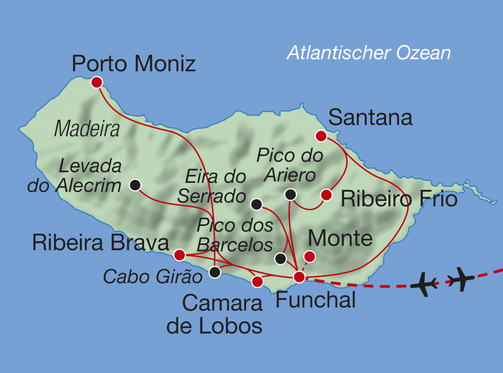 6. Tag, Ausflug in den Osten Madeiras: Der Tag startet mit der Fahrt hinauf zum Pico do Arieiro, dem zweithöchsten Gipfel der Insel. Von hier geniessen Sie ein atemberaubendes Panorama über die Bergwelt Madeiras. Weiterfahrt nach Ribeiro Frio, einem Naturschutzgebiet im Lorbeerwald und Teil des UNESCO-Weltnaturerbes. Nutzen Sie die freie Zeit für den Besuch einer Forellenzucht oder einen Spaziergang zum Aussichtspunkt Balcõe. Danach Weiterfahrt nach Santana, berühmt für seine strohgedeckten Häuser. Mittagessen in einem lokalen Restaurant und anschliessend Rückfahrt entlang der Ostküste. Dabei passieren Sie Porto da Cruz mit seiner alten Zuckerrohrfabrik und Machico, die erste Siedlung der Insel. Vollpension.