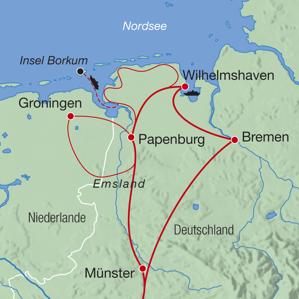 3. Tag, Ausflug Insel Borkum: Von Eemshaven aus fahren Sie mit der Fähre nach Borkum, der grössten Ostfriesischen Insel. Am Hafen wartet bereits die historische Inselbahn, die Sie in gemütlicher Fahrt direkt ins Zentrum bringt. Hier steigen Sie um in die Wegebahn «Moritz», die Sie auf eine unterhaltsame Rundfahrt über die Insel mitnimmt. Bequem erleben Sie die Dünenlandschaften, die markanten Leuchttürme und die weiten Strände – dazu erfahren Sie viel Wissenswertes über die Natur und die Geschichte Borkums. Im Anschluss bleibt Zeit, die Promenade oder eines der gemütlichen Cafés individuell zu geniessen. Am späteren Nachmittag bringt Sie die Inselbahn zurück zum Hafen und die Fähre wieder nach Eemshaven, von wo aus Sie die Rückfahrt nach Papenburg antreten – ein erlebnisreicher Tag voller maritimer Eindrücke.
