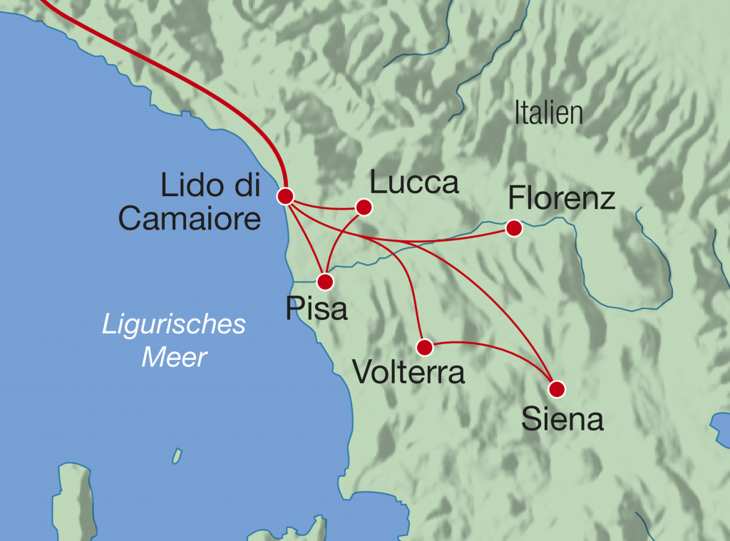 Kaum irgendwo auf der Welt finden wir eine solche Dichte an Kulturschätzen und bestens erhaltenen, mittelalterlichen Städten wie in der Toskana. Durch Hügellandschaften mit Zypressen und Weinbergen fahren Sie von einer beeindruckenden Stadt zur nächsten. Sie besuchen Orte mit grosser Vergangenheit und Ihnen begegnen Schöpfungen der bedeutendsten Baumeister und Maler. Daneben bleibt Ihnen aber auch genügend Zeit für einen Spaziergang am Meer entlang oder um das rege Treiben auf der Piazza zu beobachten.