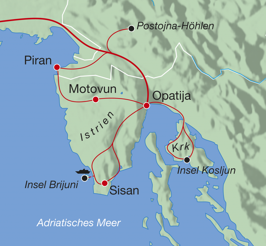 Per Schiff erreichen Sie die Inselwelt von Brijuni. Neben archäologischen Ausgrabungen und verschiedenen Ausstellungen ist Brijuni bekannt für die Sommerresidenz des ehemaligen Staatschefs Tito. Sie war nur Auserwählten zugänglich; Tito empfing hier bedeutende Politiker und Berühmtheiten aus dem Filmgeschäft. Da er Tiere liebte, brachten ihm viele internationale Gäste exotische Tiere als Geschenk mit, für die er einen Safaripark anlegte, der auch heute noch existiert. Auf der Rückreise legen Sie einen Halt in Sisan ein. Auf einem innovativen Weingut erleben Sie die Köstlichkeiten des kroatischen Weinanbaus bei einer Degustation im herrlichen Ambiente.