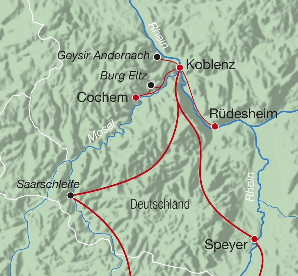 Zwischen Rheinromantik und Moselidylle erwarten Sie märchenhafte Burgen, charmante Weinstädtchen und einzigartige Naturwunder. Von Speyer über Koblenz und Rüdesheim bis zur Burg Eltz – eine Reise voller Genussmomente und unvergesslicher Eindrücke.