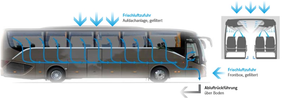 Temperierte Luft mit maximalem Frischluftanteil wird von oben eingeführt und im Fussraum abgeführt. In dieser vertikalen Luftbewegung werden gewaltige Luftmassen zugfrei bewegt. Als Vergleich: je nach Grösse des Reisecars wird pro Stunde die Luftmenge von bis zu 35 Einfamilienhäusern gewechselt.