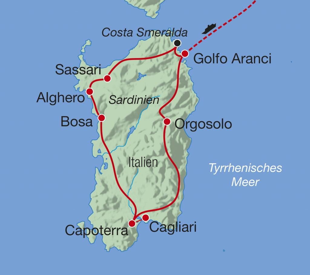 1. Tag, Schweiz - Livorno - an Bord: Fahrt vom Einsteigeort via Gotthard - Mailand nach Livorno. In der Nacht Fährüberfahrt auf die Insel Sardinien. Frühstück.