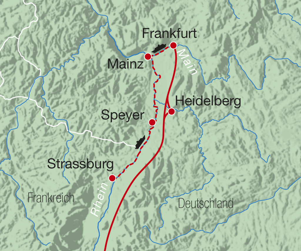 1. Tag, Schweiz - Frankfurt: Fahrt im Car vom Einsteigeort in Richtung Frankfurt. Unterwegs Zwischenhalt in Heidelberg - geniessen Sie die Mittagszeit nach Ihrem Geschmack in der romantischen Altstadt mit Schlossblick, verwinkelten Gassen und dem Flair einer der ältesten Universitätsstädte Europas. Am Nachmittag Weiterfahrt nach Frankfurt. Einschiffung und Bezug Ihrer gebuchten Kabine. Am frühen Abend heisst es: «Leinen los». Sie fahren zunächst auf dem Main und erreichen abends bei Mainz den Rhein. Geniessen Sie die erste Nacht in Ihrem fahrenden Hotel und die vorzügliche Küche an Bord.