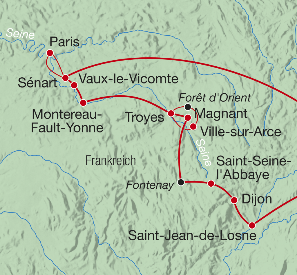 Mit 775 km Länge ist die Seine der zweitlängste Fluss in Frankreich. Nur wenige Kilometer nordwestlich der burgundischen Stadt Dijon entspringt dieser bedeutende Strom und führt durch die ländlichen Regionen Burgund und Champagne in die Île-de-France, den grossen Ballungsraum von Paris. Höhepunkte dieser Reise sind Dijon, Troyes, Champagner, Vaux-le-Vicomte und natürlich das finale Foto von Ihnen mit dem E-Bike am Eiffelturm. Sind wir im Burgund und in der Champagne vom zweiten bis vierten Tag überwiegend auf kleinen Nebenstrassen unterwegs, werden es in der Île-de-France und in Paris nahezu nur Radwege sein.