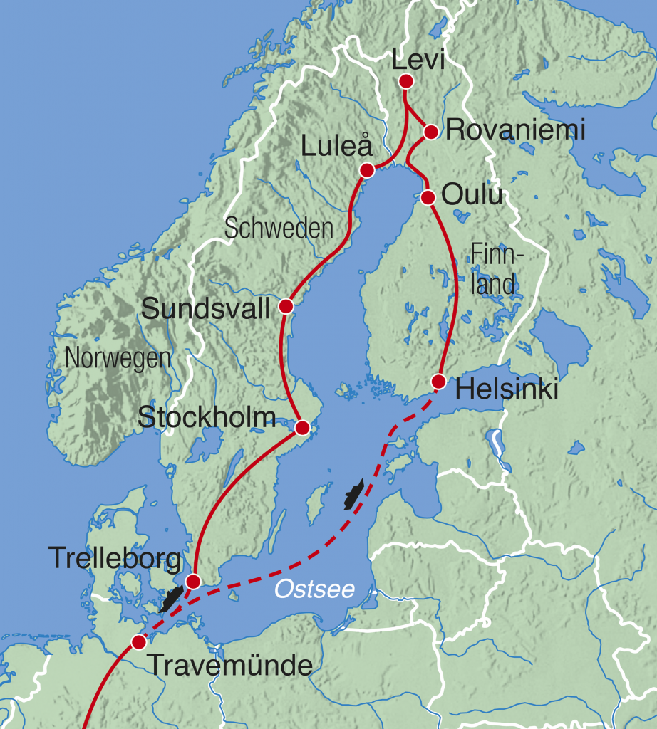 1. Tag, Schweiz - Travemünde - an Bord: Fahrt vom Einsteigeort nach Travemünde, wo Sie zur Fährüberfahrt nach Finnland einschiffen. Halbpension.