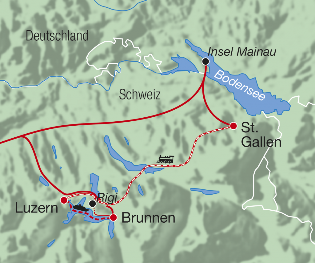 Von der farbenprächtigen Blumeninsel Mainau über die Fahrt im Voralpen-Express nach Luzern mit einer gemütlichen Schifffahrt auf dem Vierwaldstättersee bis hin zum Ausflug auf die Rigi, der «Königin der Berge». Geniessen Sie Natur, Kultur und unvergessliche Ausblicke.
