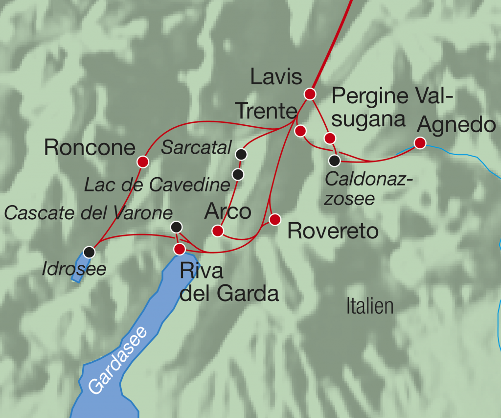 2. Tag, Ausflug Gardasee - Varone-Wasserfall: Die erste Etappe startet in Rovereto. Entlang des Etschradwegs geht es talwärts bis nach Mori. Von hier führt die Strecke über den Passo San Giovanni nach Torbole, wo sich ein herrlicher Blick auf den Gardasee öffnet. Am Ufer des grössten italienischen Sees geniessen Sie Ihre Mittagspause. Anschliessend fahren Sie weiter entlang des Ufers zum malerischen Ferienort Riva del Garda. Die farbenfrohen Gassen laden zum Flanieren ein und das Gelato im Café «Flora» darf hier fast nicht fehlen. Später geht es am Fusse des Monte Tombio nach Gavazzo und weiter zum Varone-Wasserfall. Der fast 100 m hohe Wasserfall entspringt dem Bach Magnone, der in den Gardasee mündet. Dieses beeindruckende Naturschauspiel bildet den Abschluss des ersten Tages. Halbpension. (Tagesroute: ca. 41 km; 400 m auf / 495 m ab)
