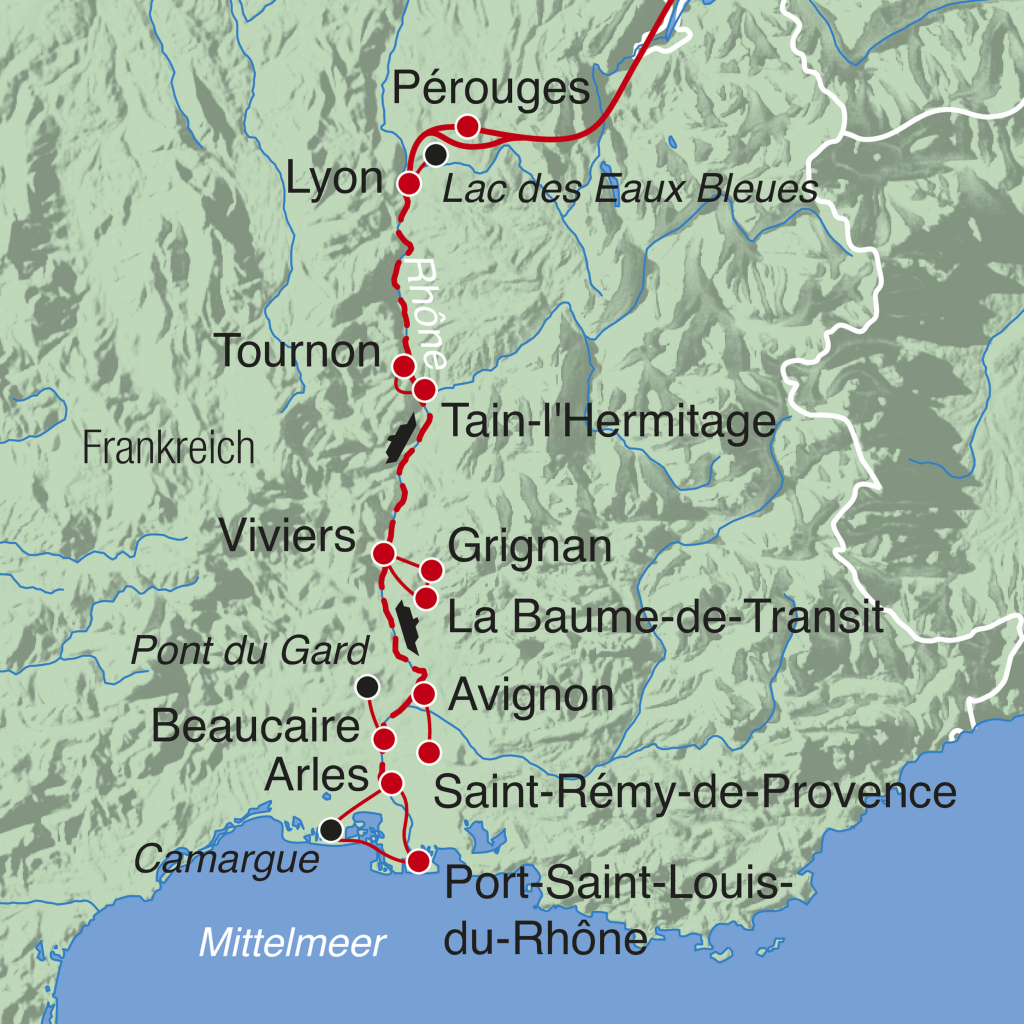 1. Tag, Schweiz - Lyon: Gleich am Anreisetag treten Sie in die Pedale: Die Etappe beginnt im Tal des Ain in Château-Gaillard und führt über Saint-Maurice-de-Rémens nach Pérouges, eines der «Plus beaux villages de France». Ein Spaziergang durch die engen Gassen entführt Sie ins Mittelalter. Anschliessend Weiterfahrt zur Einschiffung nach Lyon. Geniessen Sie die Abfahrt vom Sonnendeck aus. (Tagesroute: ca. 20 km; 210 hm auf / 200 hm ab)