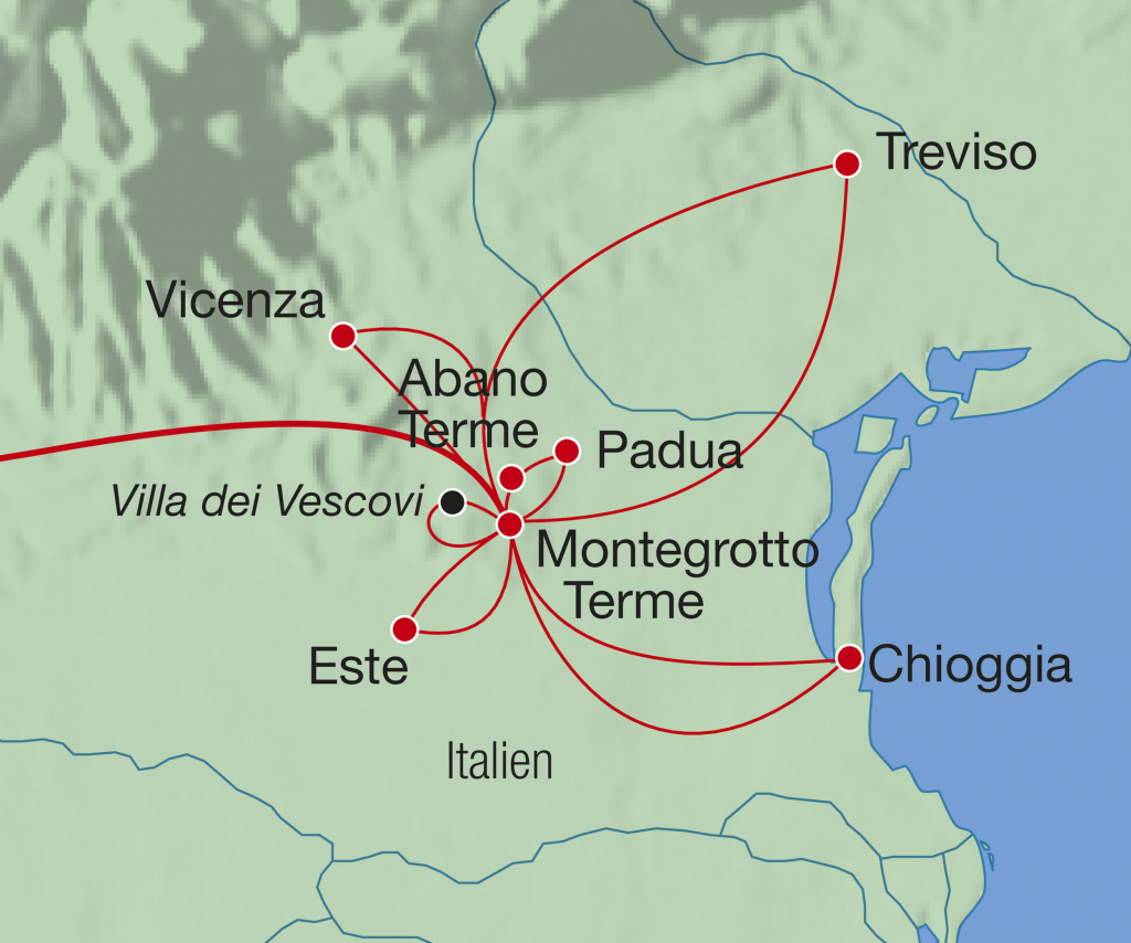 1. Tag, Schweiz - Montegrotto Terme: Fahrt vom Einsteigeort via Gotthard - Mailand nach Venetien in den idyllischen Thermalort Montegrotto Terme.
