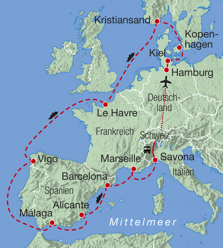 Von den nordischen Metropolen bis zu den sonnenverwöhnten Küsten Spaniens: Diese besondere Kreuzfahrt verbindet Vielfalt, Kultur und Genuss. Starten Sie in Hamburg, entdecken Sie pulsierende Städte wie Kopenhagen, Barcelona und Marseille und lassen Sie sich von den abwechslungsreichen Landschaften der Normandie, Galiciens und Andalusiens verzaubern. An Bord geniessen Sie entspannte Seetage, kulinarische Höhepunkte und komfortable Erholung.